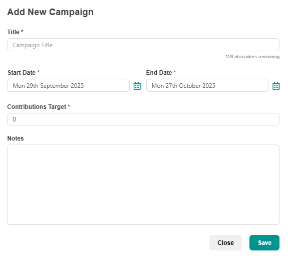 - Enter 'Contributions Target' - This is the total target over the period of the campaign that you would like to achieve or contribute towards.