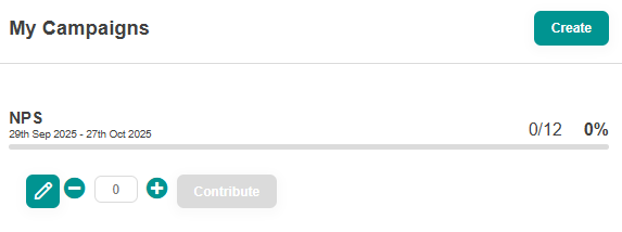 - Once saved your campaign will appear on your Me dashboard under the 'My Campaign' widget, outlining the behaviour/numeric goal you are working towards, the period and what % of it has been completed.