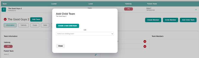 - Click on 'Add Child Team' button as shown below. A pop up will appear with the option to either "Create a new child team" or Select from the drop down existing teams.