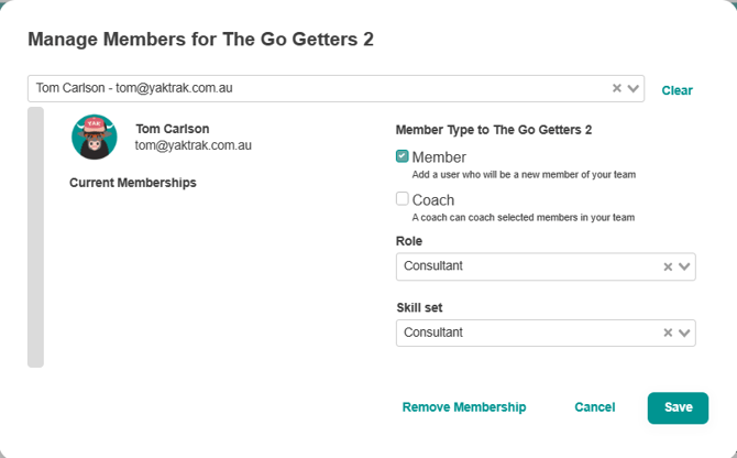 - Select 'Member' if they are to be a normal member of the team you are adding them to.