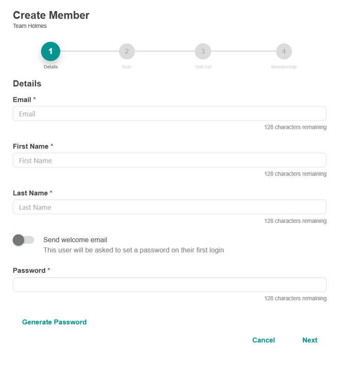 - Select if you would like to send the user a welcome email or not. If you choose not to, you will need to generate a password and advise the team member. If you choose to send them a welcome email they will be prompted to login and reset their password.